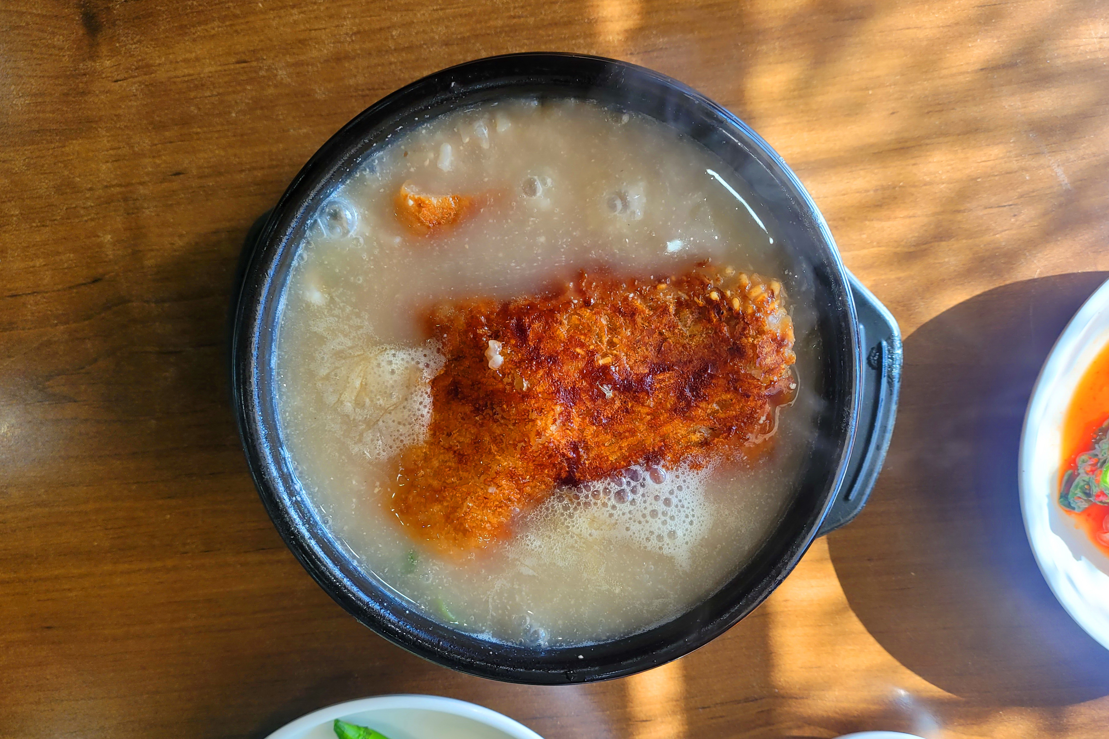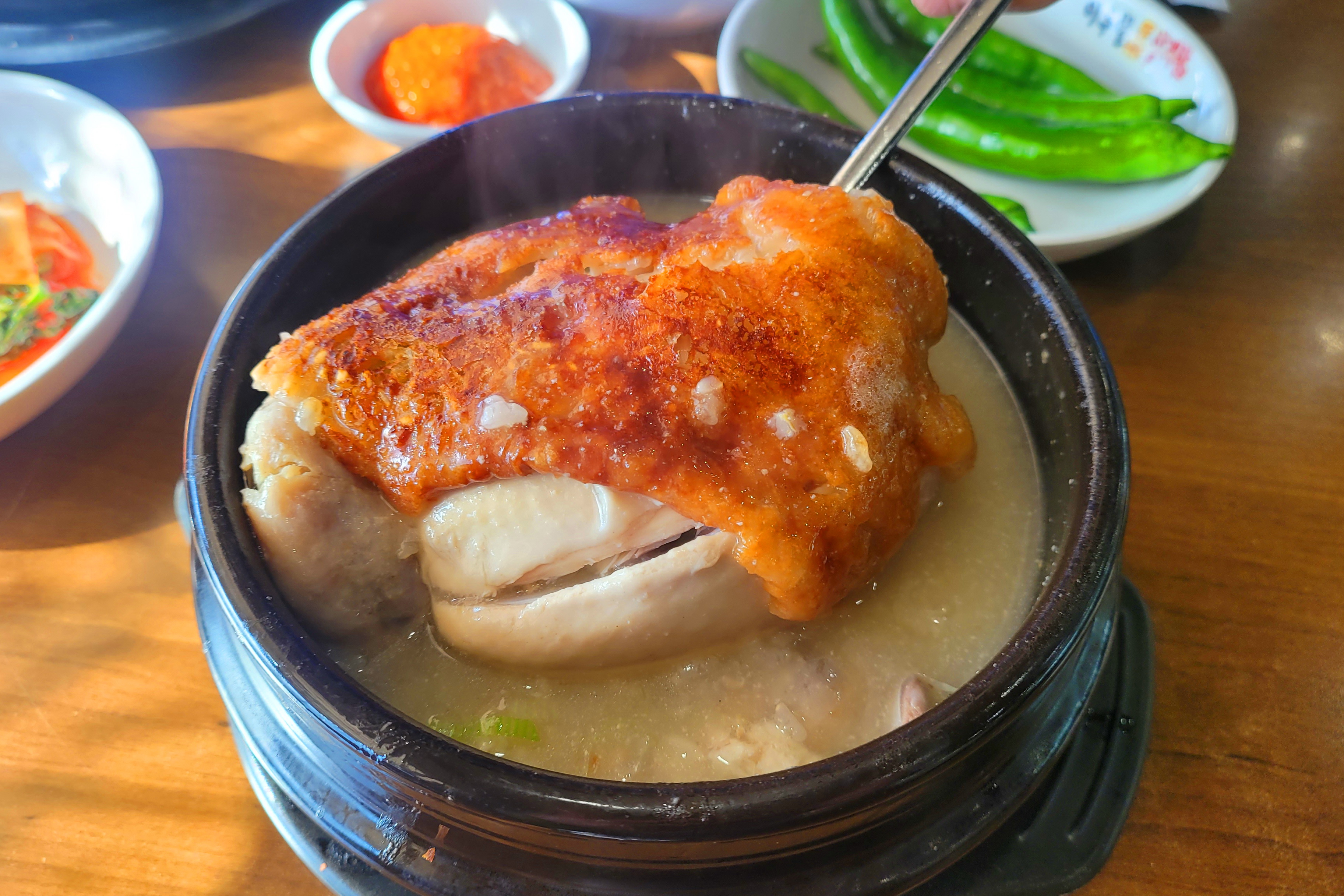보글보글 끓는 삼계탕이 구수한 냄새를 풍긴다. 위의 붉은색 누룽지를 걷어내면 뽀얀 속살의 삼계탕이 보인다.
