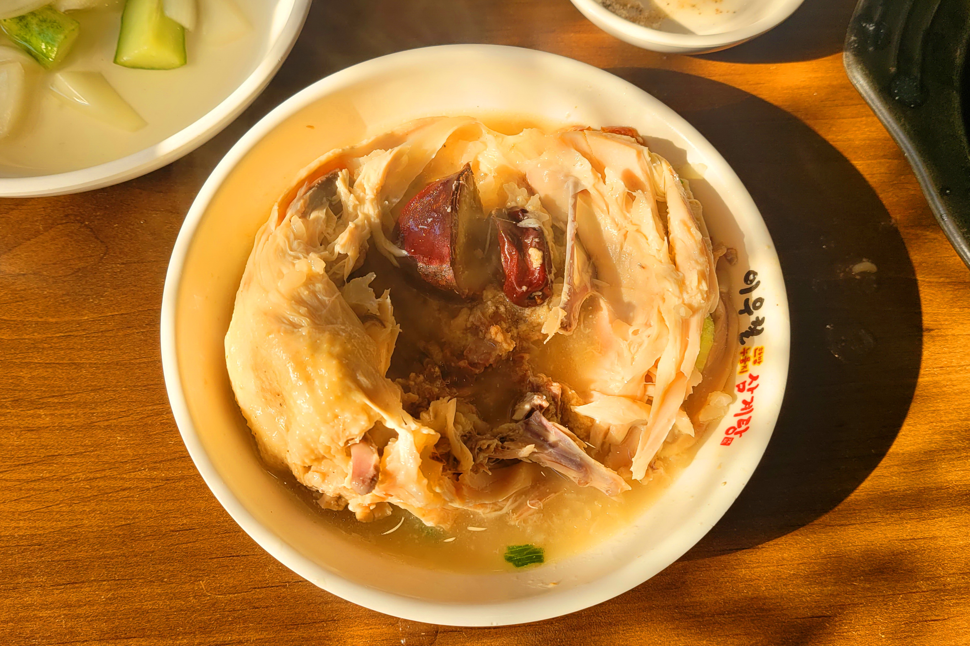 닭의 속에 밤, 대추 등의 한방약재가 들어가 있다. 구수한 맛이 일품이다.