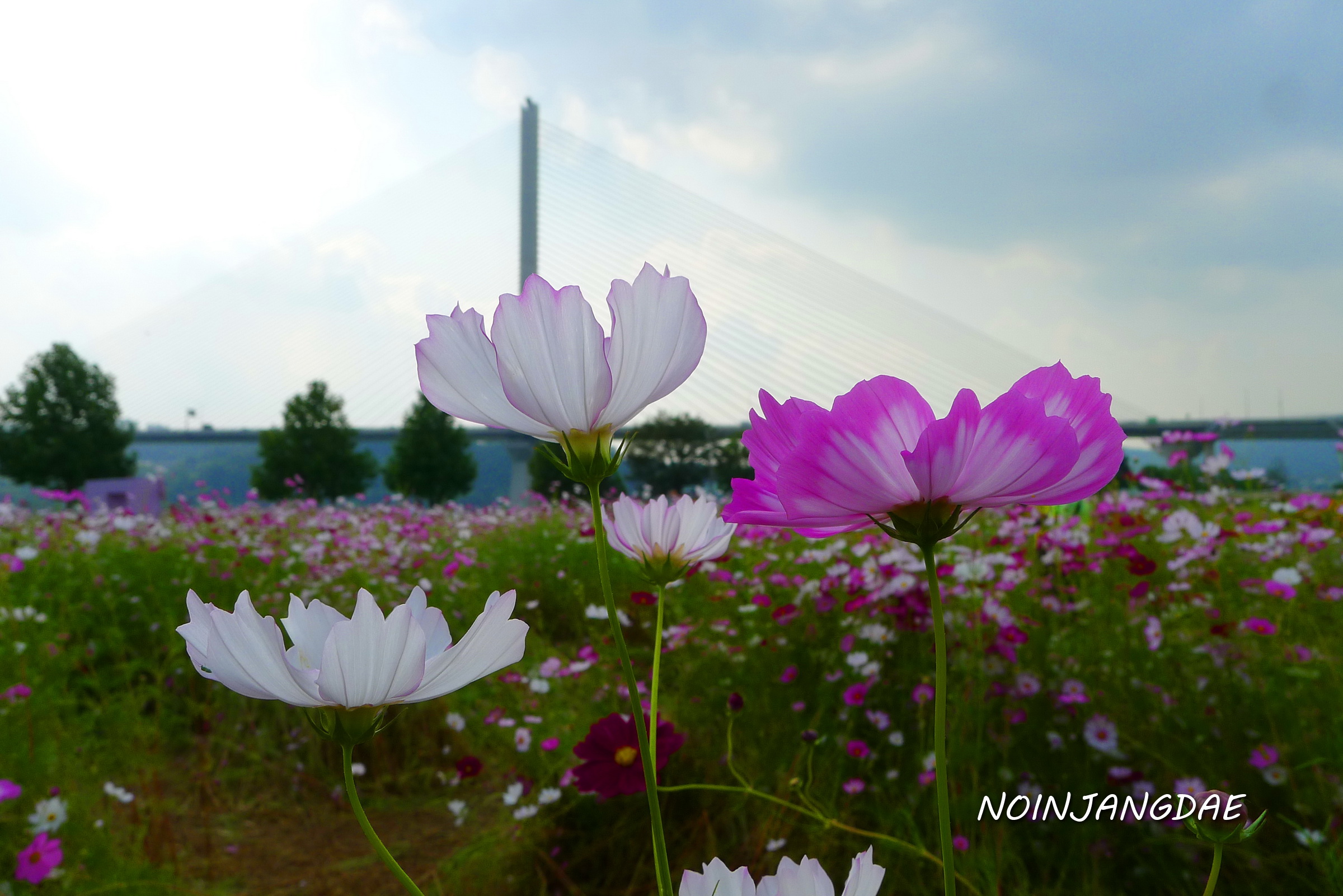 주위의 푸른 수목과 위풍당당한 다리와 변화무쌍한 하늘의 구름을 배경으로 코스모스 촬영을 시작한다.