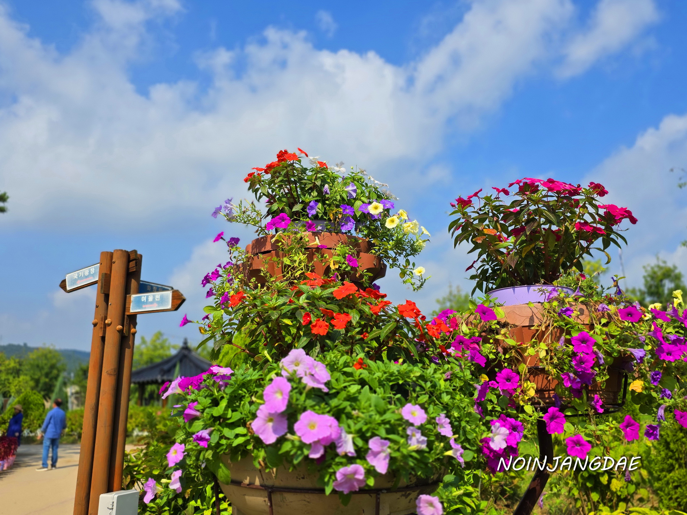 중앙 도로를 따라가면 대단지 꽃밭이 있다는 현수막이 걸려있다.