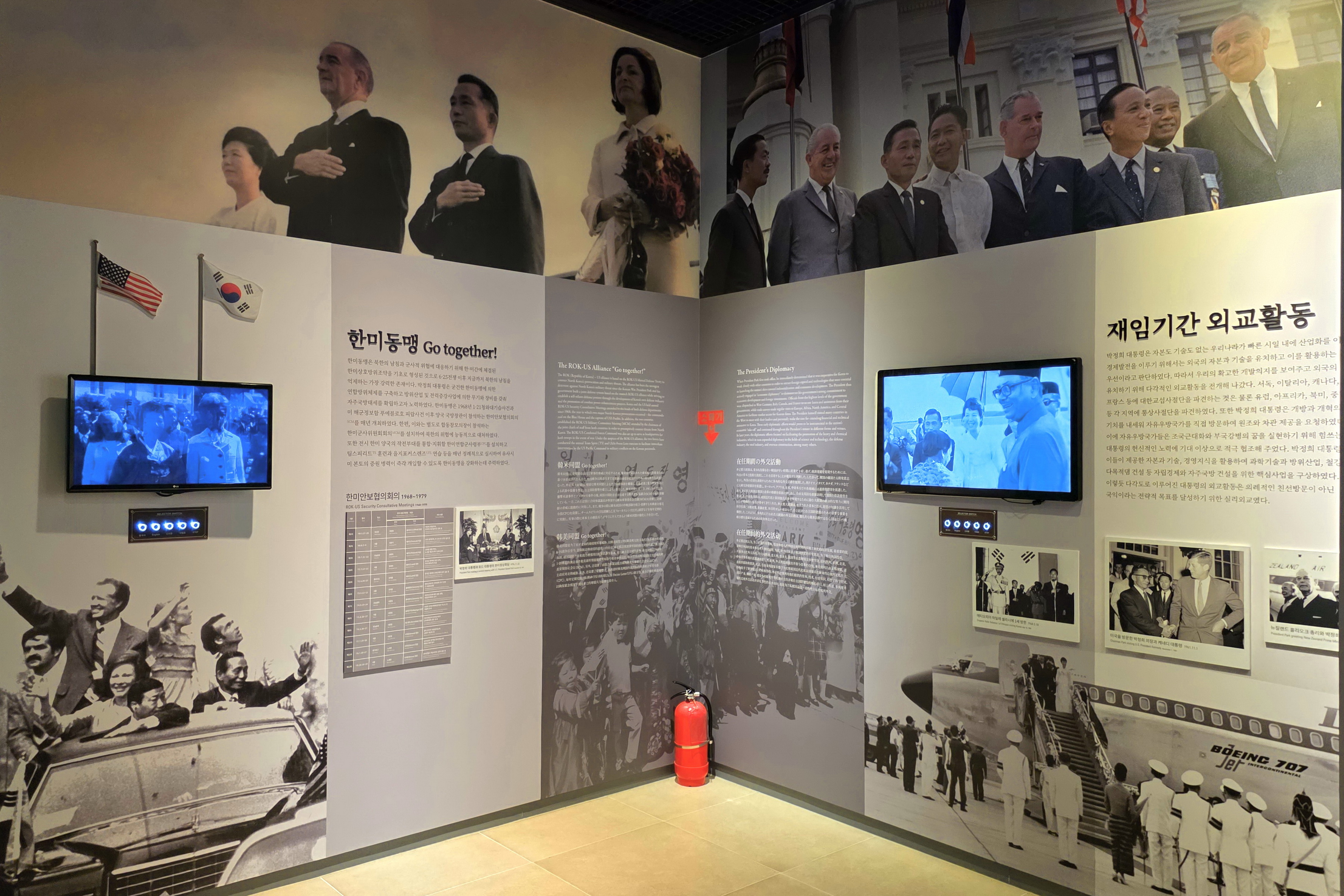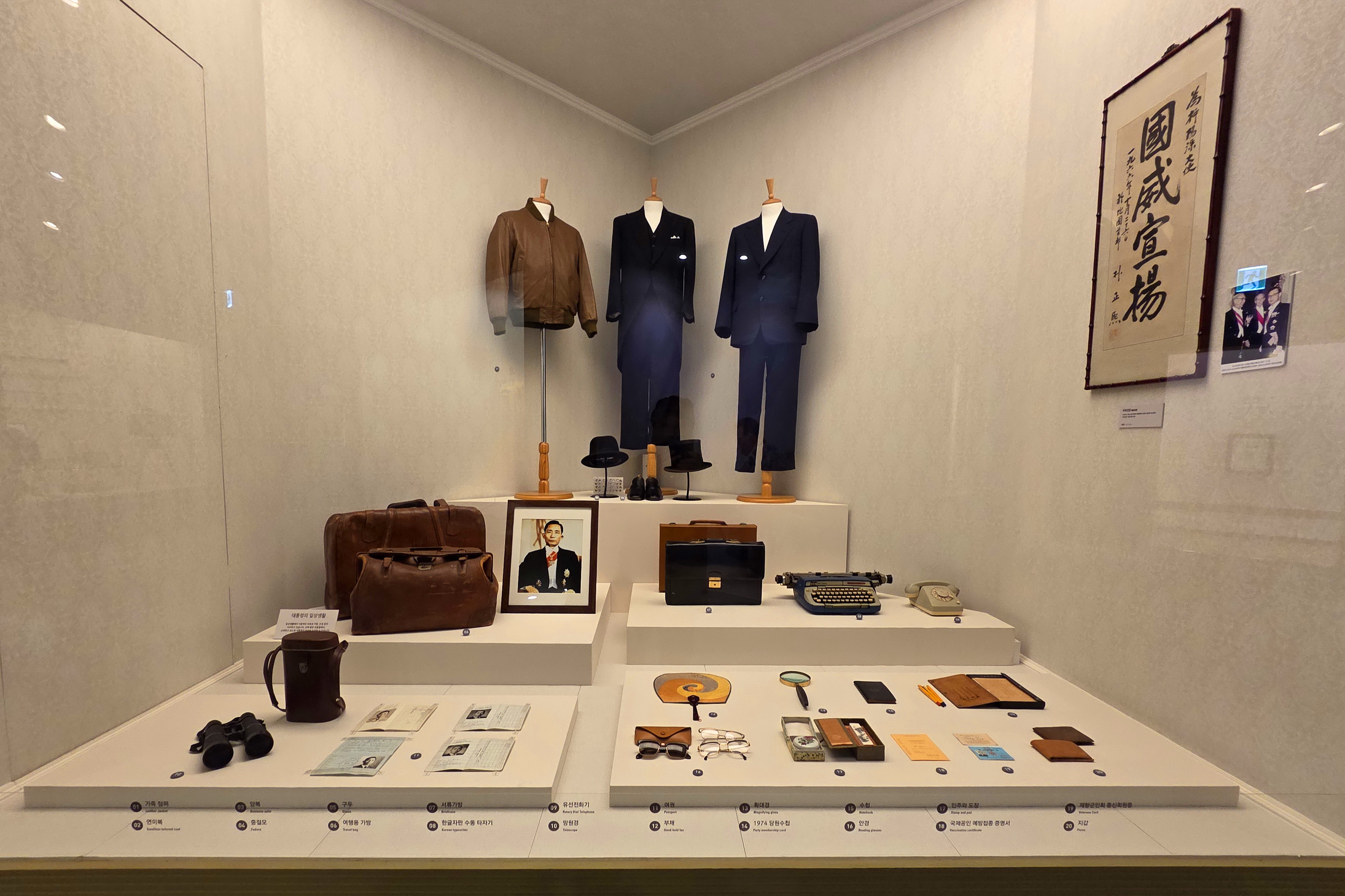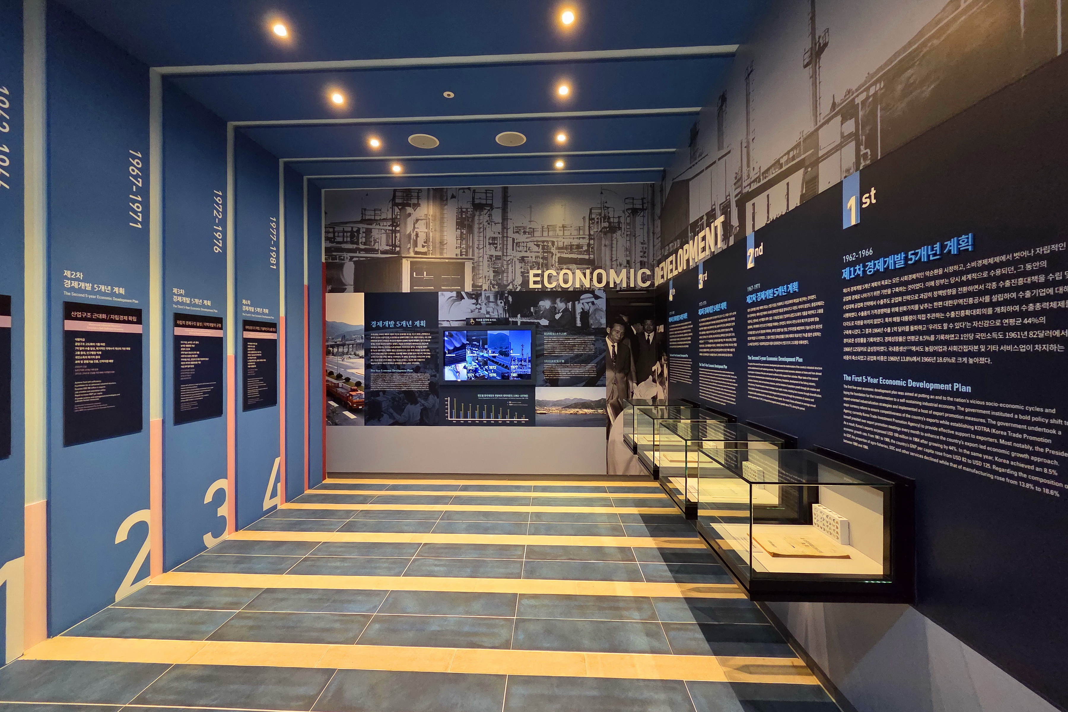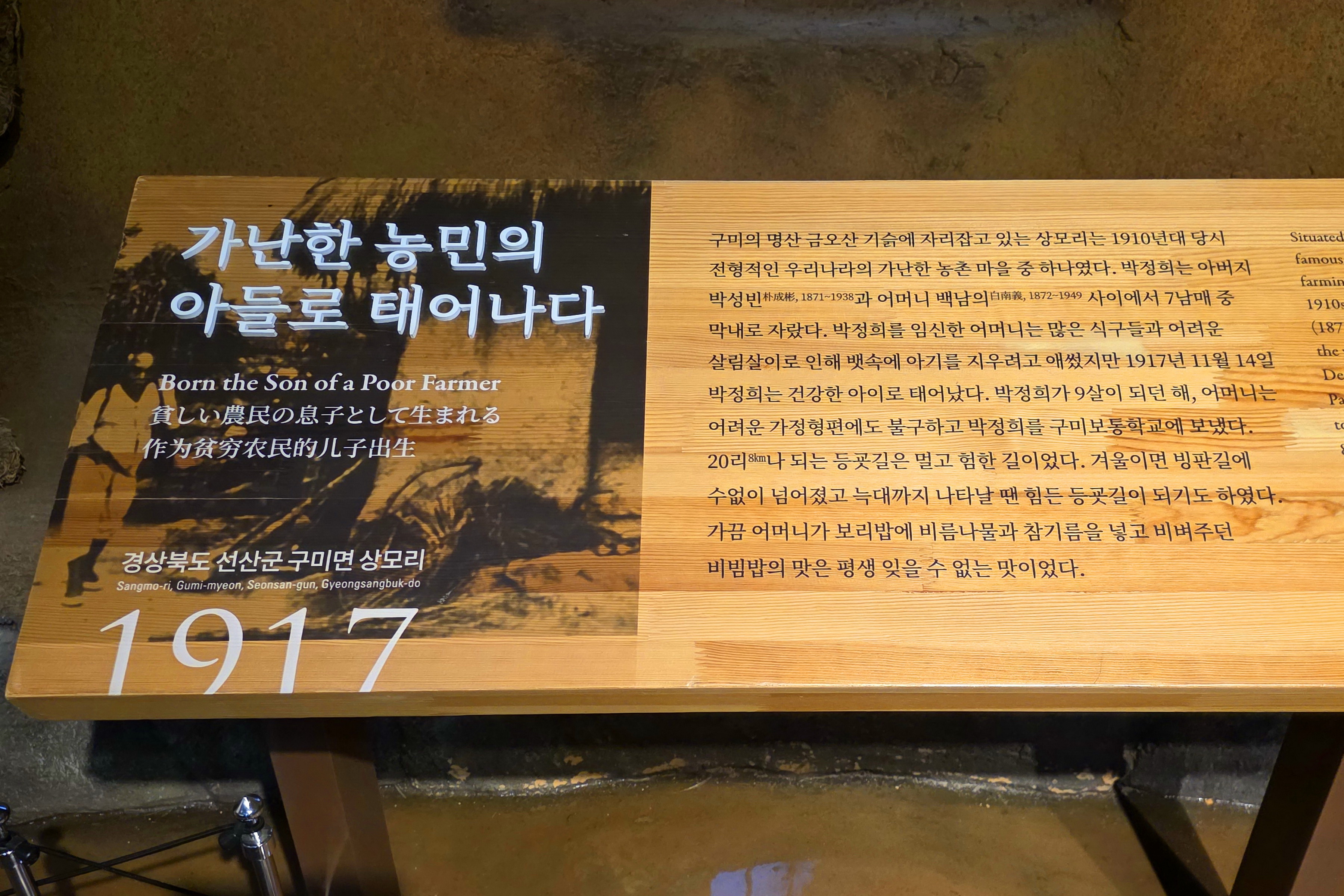 박정희기념관 1층에는 1 전시실과 2 전시실로 구분되어 있고, 2층은 3 전시실과 추모의 영역으로 꾸며져 있다.