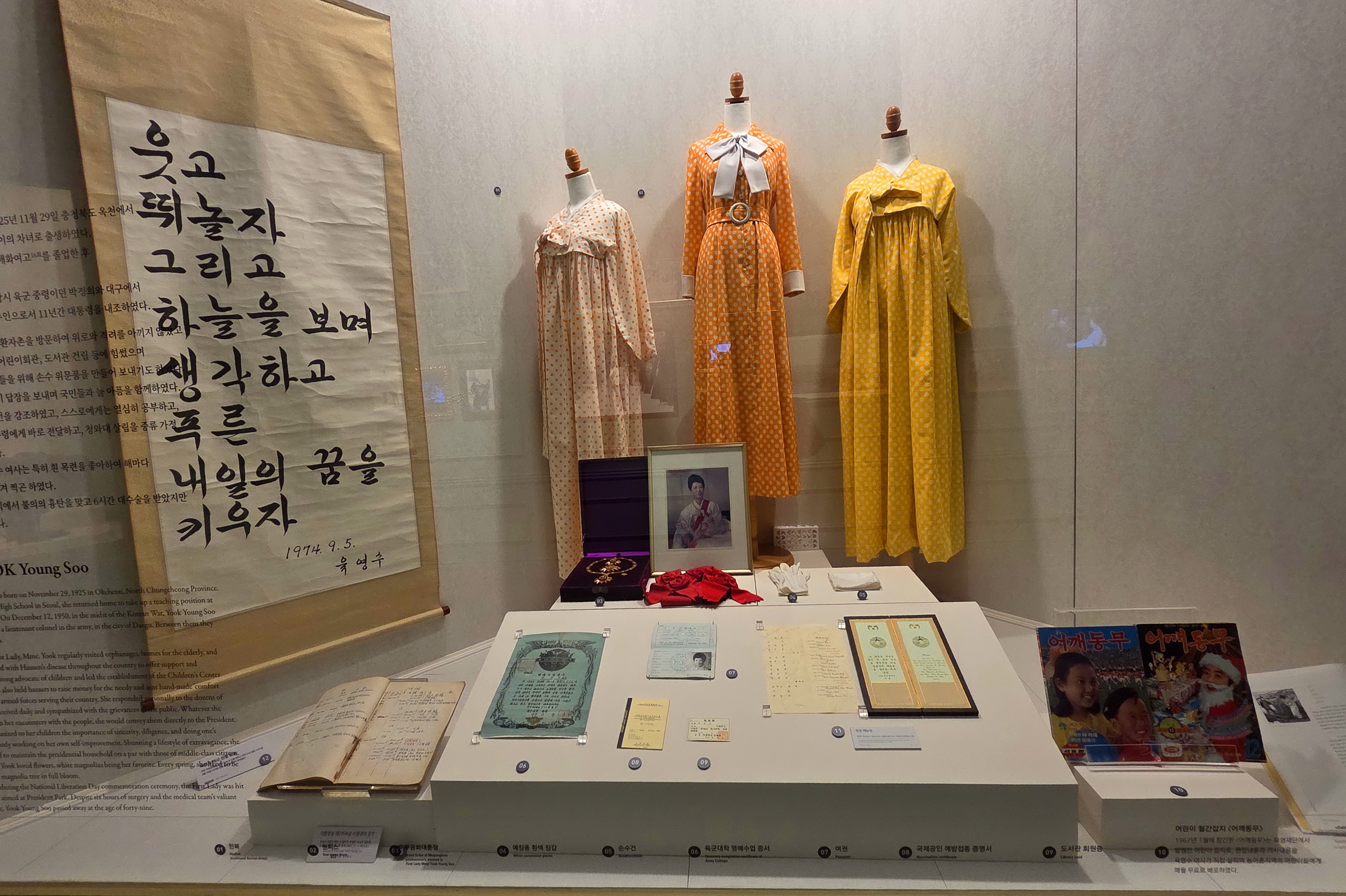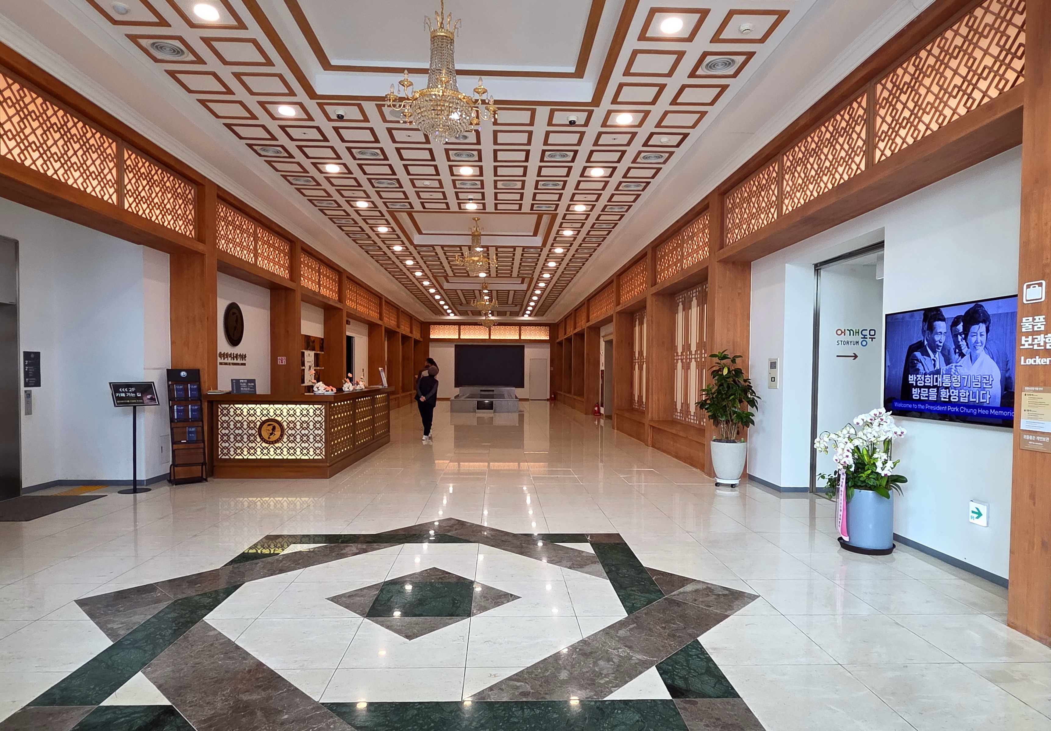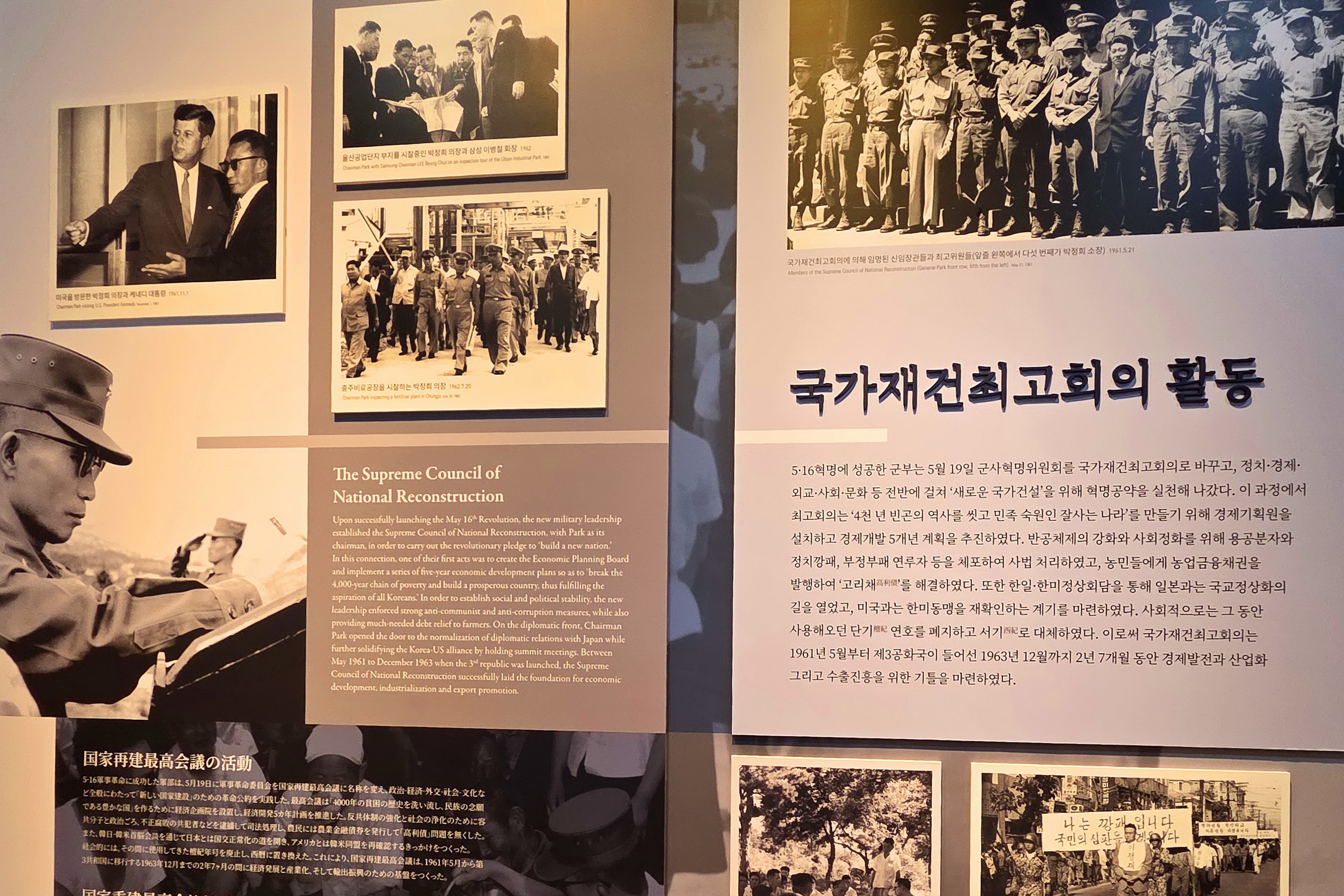 박정희기념관 1층에는 1 전시실과 2 전시실로 구분되어 있고, 2층은 3 전시실과 추모의 영역으로 꾸며져 있다.