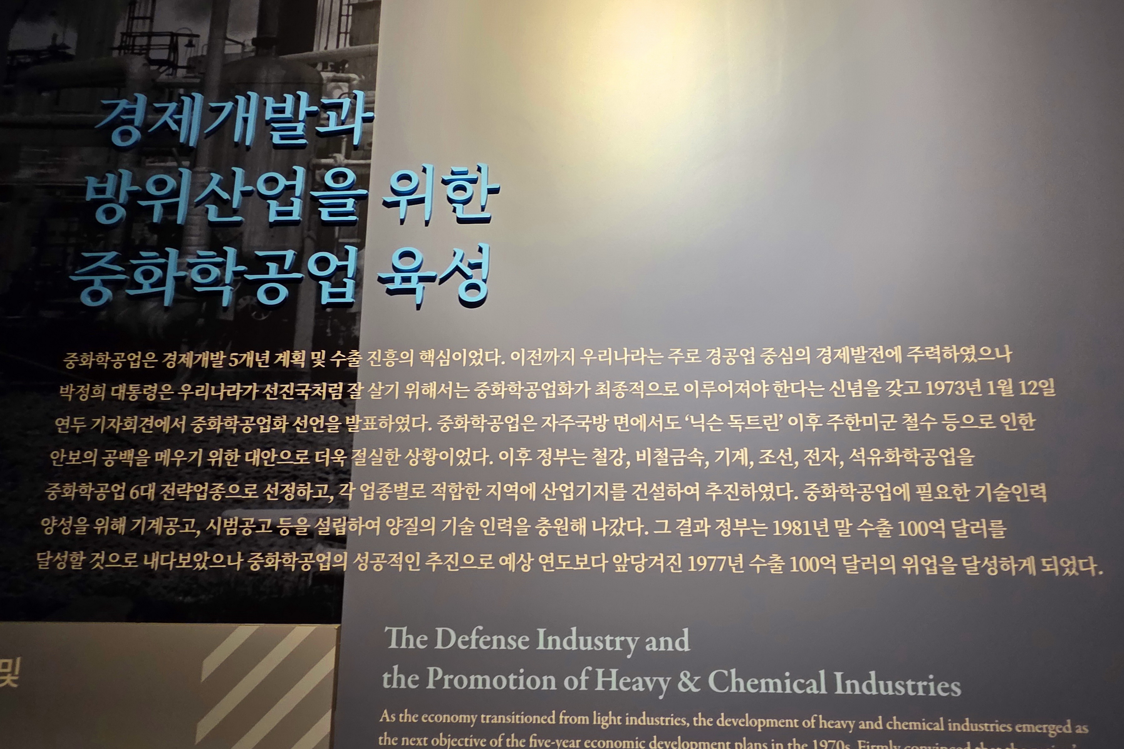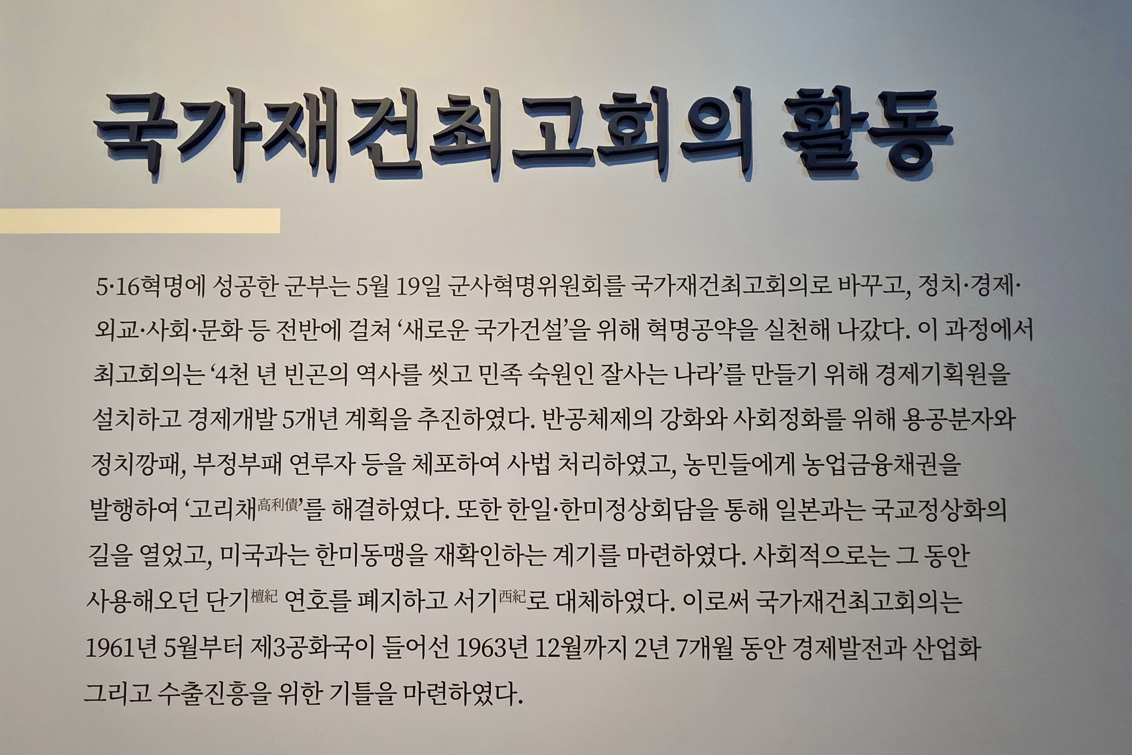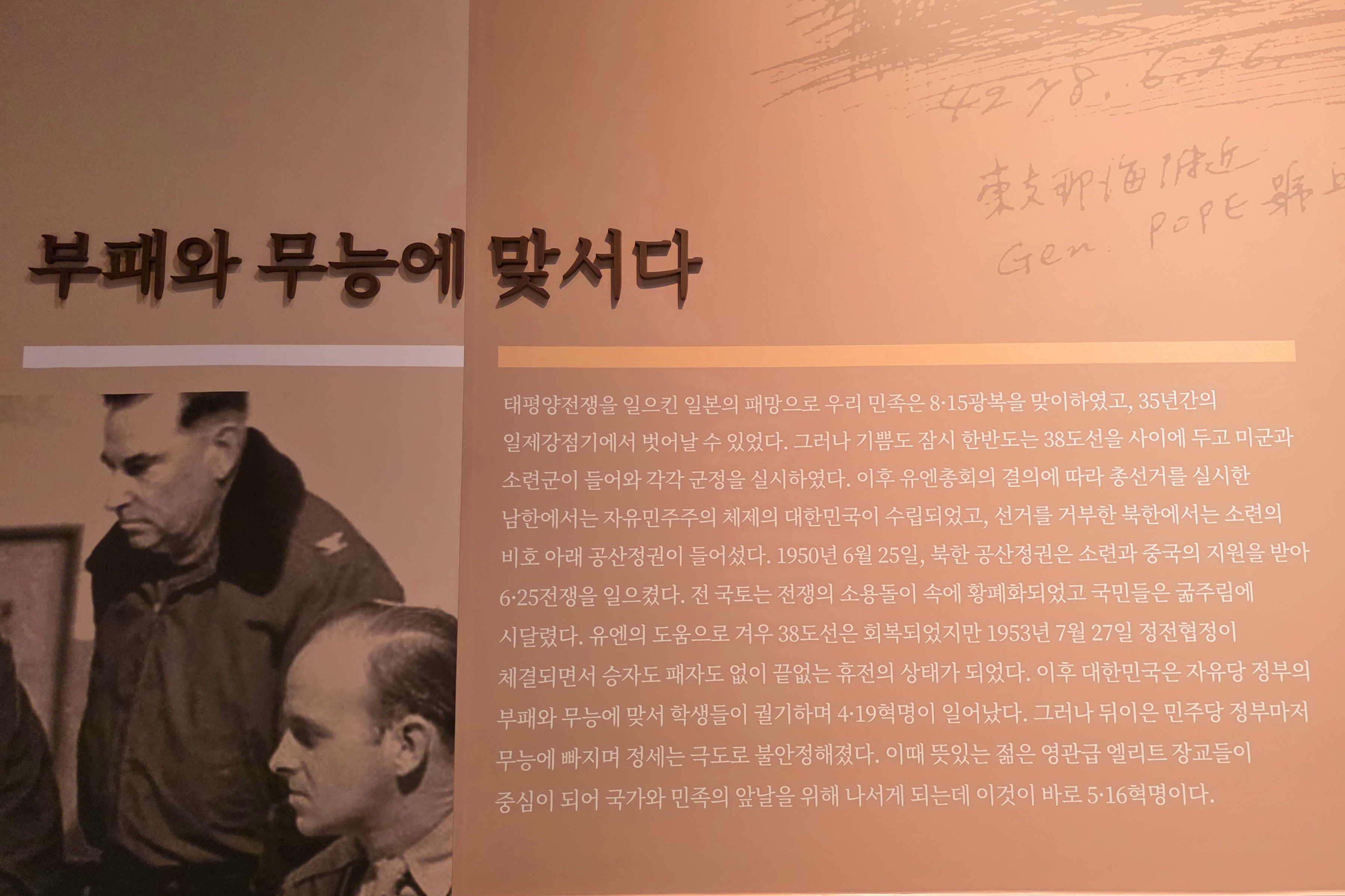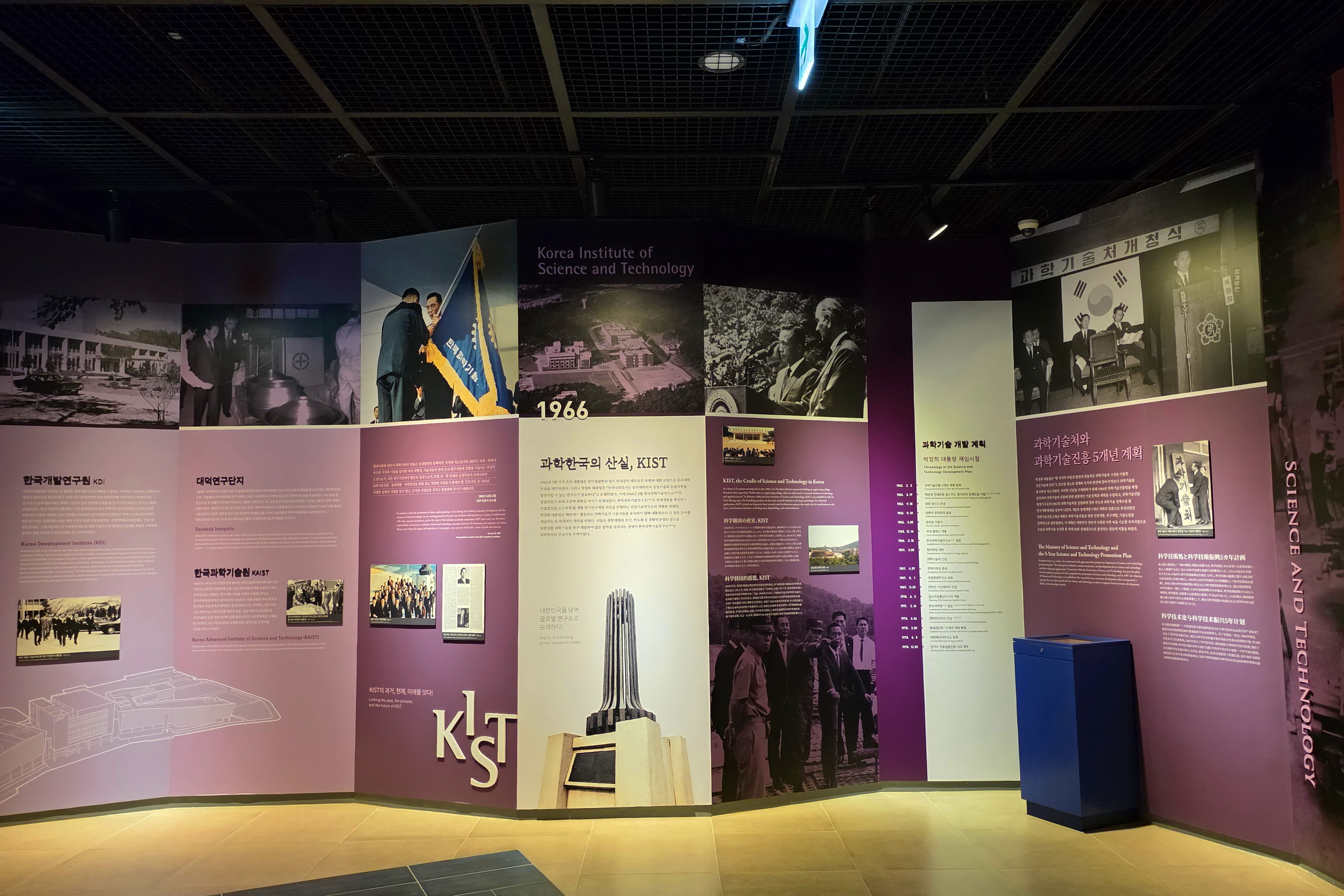 박정희기념관 1층에는 1 전시실과 2 전시실로 구분되어 있고, 2층은 3 전시실과 추모의 영역으로 꾸며져 있다.